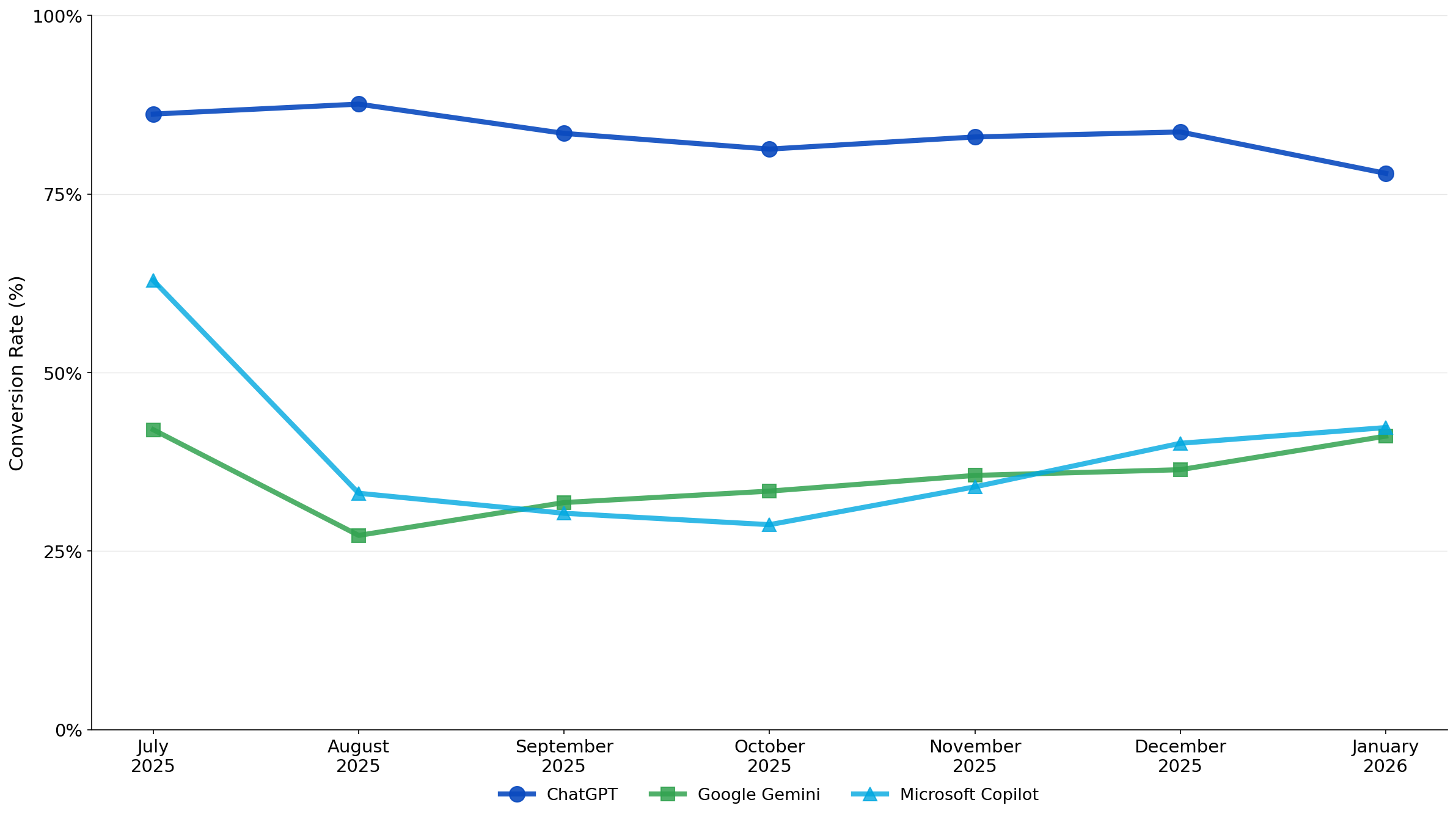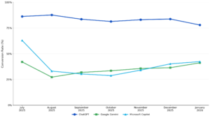 ChatGPT’s 83.1% workplace conversion rate and 55.2% market share reflect entrenched product-market fit. Competitors are not displacing ChatGPT. They are competing for second position. Gemini demonstrated that share can shift when product experience improves. Copilot demonstrated that share can decline when it does not.