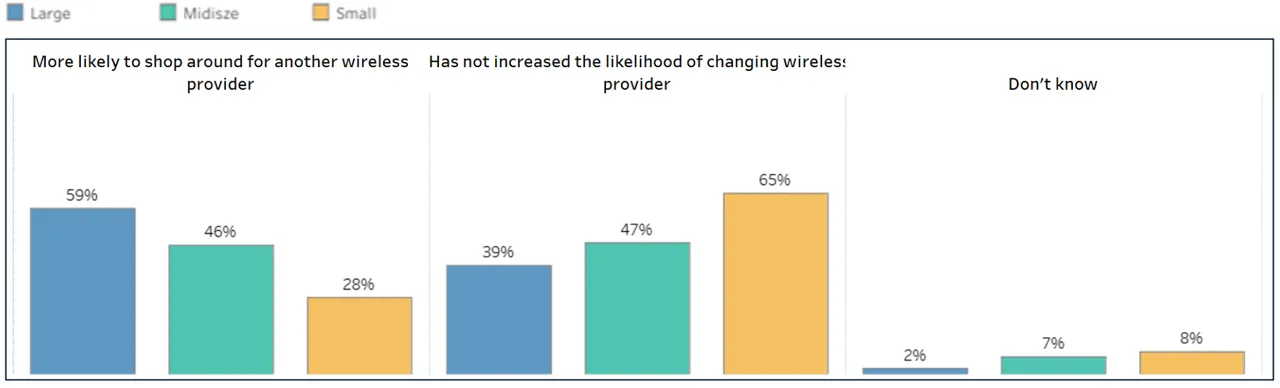 Among current Verizon Wireless business customers asked how the outage affected their likelihood of staying after their current agreement, small businesses were the most forgiving: 65% said the outage had not increased their likelihood of changing providers, 28% said they were more likely to shop around, and 7% were unsure or did not respond. Large businesses showed a different picture, with 39% saying the outage had not increased their likelihood of switching, 59% said they were more likely to evaluate alternatives, and 2% were unsure. Midsize was a statistical tie.