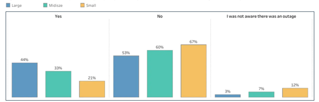 Large businesses reported the highest direct impact: 44% said the outage affected their company. Midsize companies came in at 33%. Small businesses sat at 21%. The remaining respondents in each segment indicated either no impact or were unsure. The gradient makes operational sense. Large organizations run more lines, more devices, more mission-critical workflows over wireless. A national field service operation or a distributed retail chain has thousands of points of exposure. A five-person shop has a handful. The outage hit large businesses hardest because they have the largest surface area. Large enterprises also operate more redundancy infrastructure, dedicated IT, secondary carrier contracts, Wi-Fi fallback. Whether the 44% figure reflects greater network dependency or greater issue-reporting sensitivity is not separable from this data.