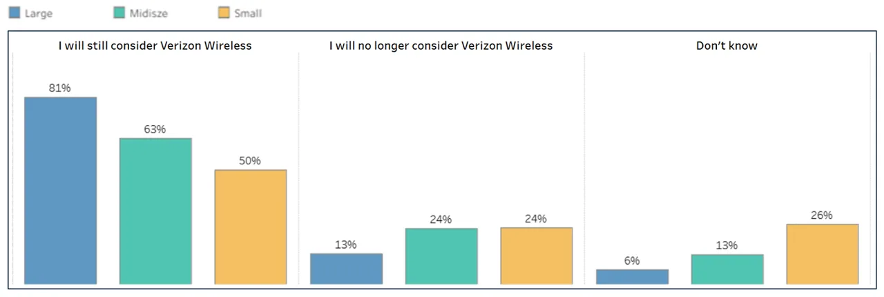 Among business customers not currently on Verizon, the outage produced differentiated responses that also track with company size.