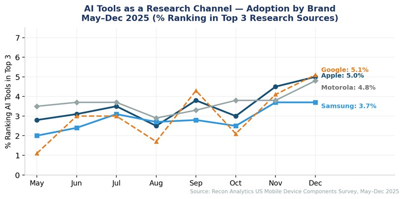 Among Apple buyers, usage of AI tools for device research climbed from 2.8 percent in May 2025 to 5.0 percent in December, a nearly 79 percent increase in eight months. Samsung’s AI research adoption also rose meaningfully, from 2.0 percent to 3.7 percent, while Motorola started the period at 3.5 percent, already above Samsung’s level throughout, and finished at 4.8 percent. That baseline anomaly is analytically significant. Motorola serves a demonstrably lower-income buyer base, yet its adoption of AI research led Samsung from the very first month. The data points to a specific use case: value-segment buyers using AI to navigate spec-to-price comparisons across a crowded $200–$400 Android mid-range market. That is a fundamentally different task from the premium ecosystem research OEM marketing teams typically assume AI serves.